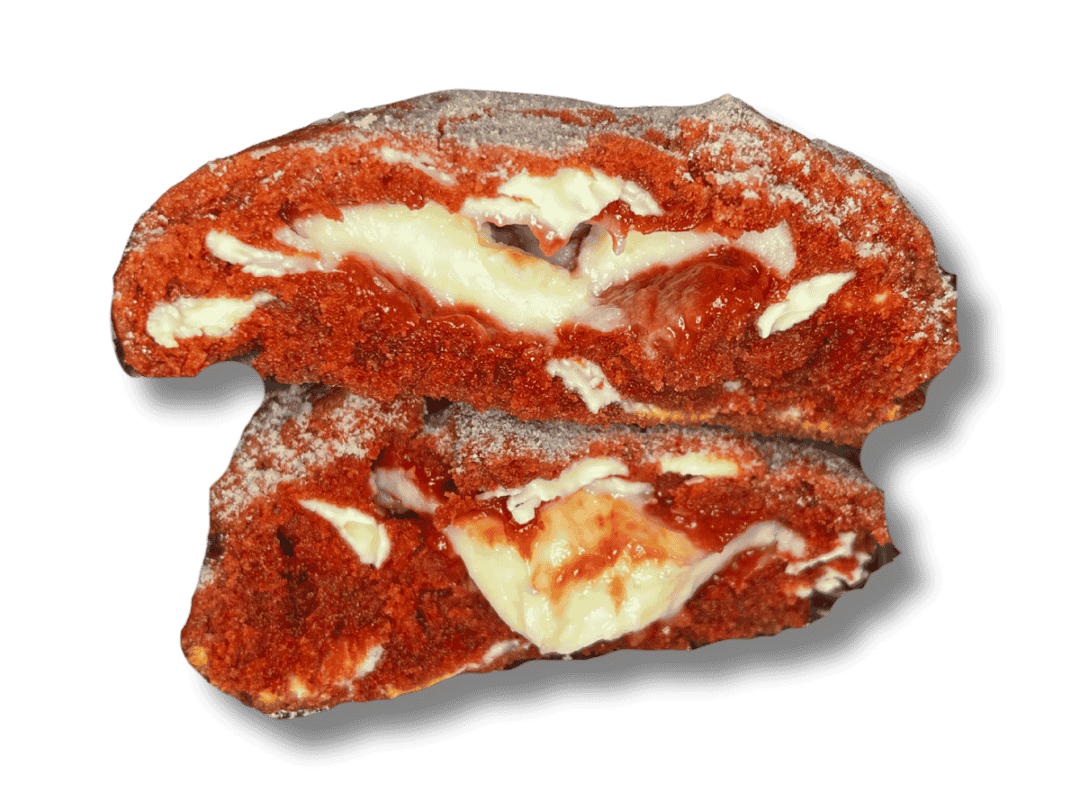 Tarwebloem, zelfrijzend bakmeel, ongezouten boter (melk), bruine basterdsuiker, kristalsuiker, eieren, volle melkpoeder (melk), baking soda, zout, vanille-extract, cacaopoeder, rode kleurstof (voedingskleurstof), roomkaasvulling (roomkaas (melk), poedersuiker), witte chocolade (suiker, cacaoboter, magere melkpoeder (melk), emulgator (soja), vanille).